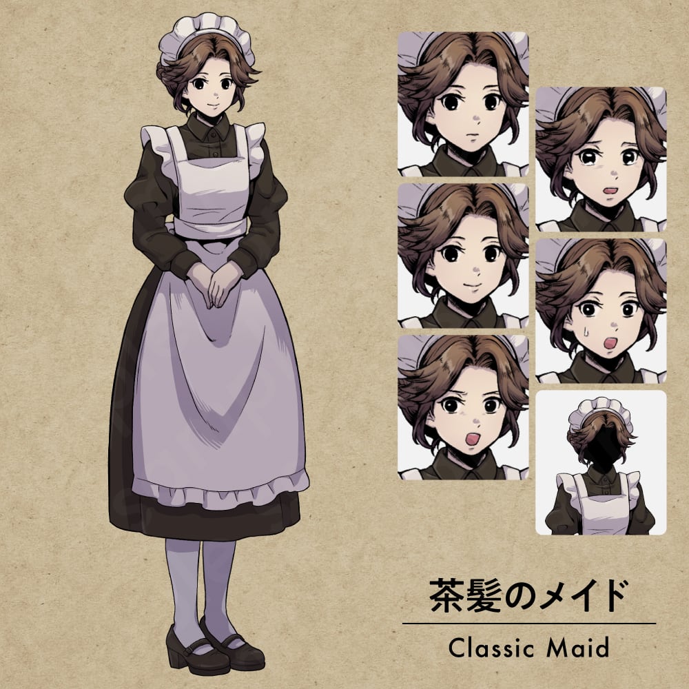 白いエプロンとヘッドドレスを纏った、優しげなメイド女性キャラ。