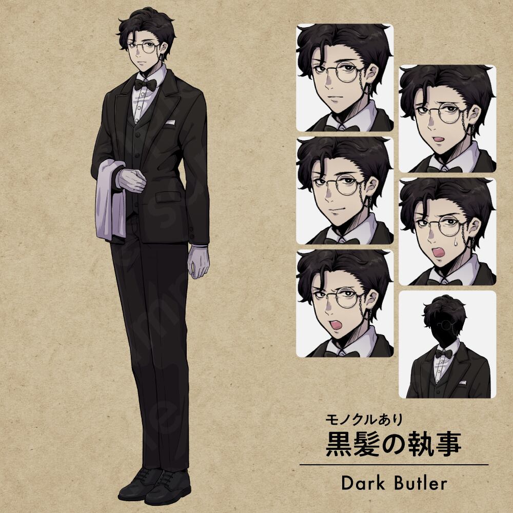 黒髪オールバックに黒縁眼鏡、モダンなタキシードを纏う冷静な執事。