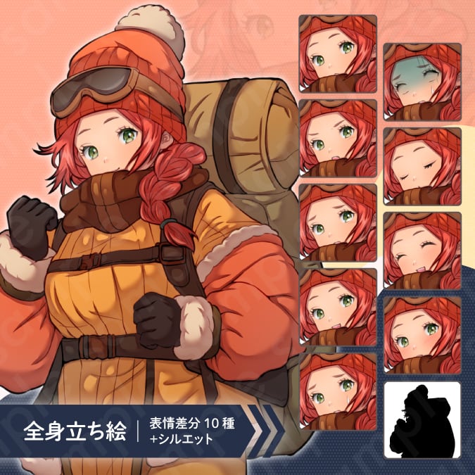 赤髪三つ編みで雪山登山の服装のキャラクターです。
