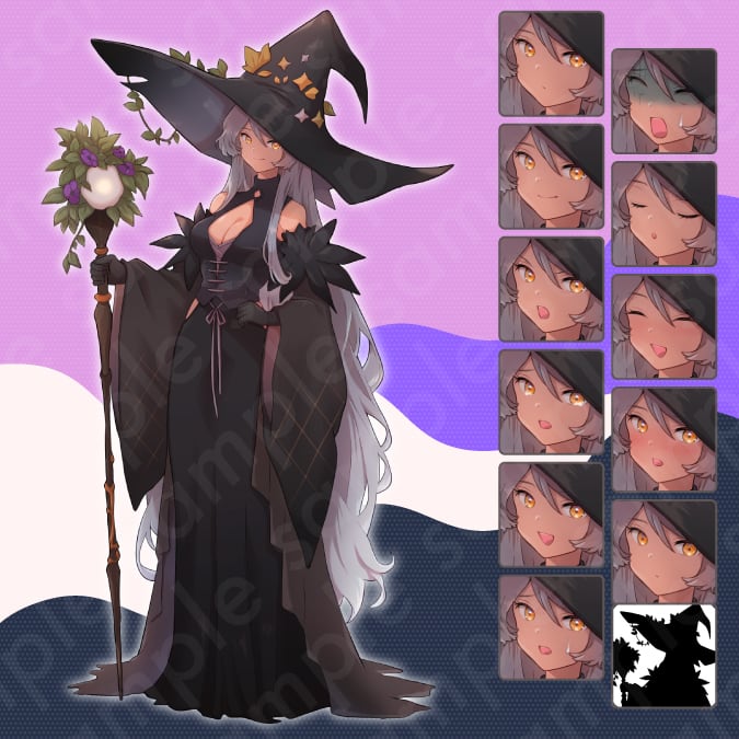 銀色のロングヘアの20代魔女風女性で、黒のマジカルハット・ロングスカートを着ており、ファンタジー系作品の立ち絵として使用することができます。