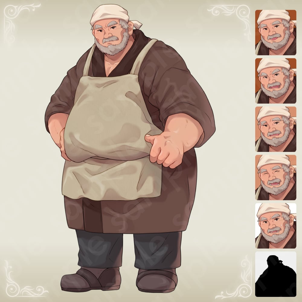 白髪&白髭の恰幅の良い店主キャラクター。エプロンを着た姿が特徴的で、村の商店や酒場、宿屋の主人など、さまざまな場面で活躍できるキャラクターです。落ち着いた雰囲気と堂々とした体格で、頼れる存在として物語に深みを与えます。